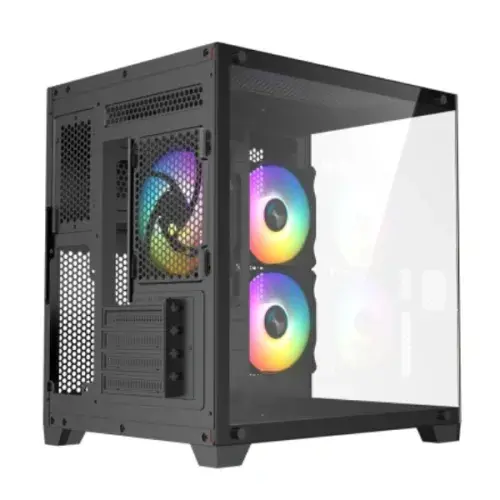 with vibrant ARGB lighting. It supports Micro-ATX and Mini-ITX motherboards,