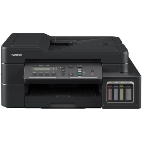Brother DCP-T720DW, Functions - Print, Copy, Scan, Printer Type - Multifunction Color INK Printer, Output Color - Color, First Page Print - 6 sec (B), 6.5 sec (C), Print Speed (Black) - 17 ipm, Print Speed (Color) - 16.5 ipm, Print Resolution (Pixel) - 1200 x 6000 dpi, Duplex Print - Automatic (Max A4), Scan Speed - 3.35 sec (B), 4.38 sec (C), Scan Resolution (Pixel) - 1200 x 600 dpi, Scan Paper Size - A4, Max. Scan Paper Size ADF - No, Min. Scan Paper Size ADF - No, Copy Speed - 10.5 Sec (Black), 21 Sec (Color), Copy Resolution (Pixel) - 1200 x 2400 dpi, Copy Size - A4, Paper Size Minimum - A6, Paper Size Max. - A4, Print Paper Size - A4, Letter, Executive, A5, A6, Photo 4 inch x 6 inch, Indexcard 5 inch x 8 inch, Photo 5 inch x 7 inch, C5 Envelope, Com-10, DL Envelope, Monarch, Photo-3.5 inchx 5 inch, Paper Weight - 80 g/m2, Paper Type - Plain, Inkjet, Glossy(cast/resin), Recycled, Input Tray - 150 sheets, Output Tray - 50 sheets, ADF - Yes (20 Sheet), Printer Memory - 128MB, Display - 1 Line LCD (16 characters), Interface (Built-in) - 1 x Hi-Speed USB 2.0 & LAN, Mobile Printing - Brother iprint & Scan, AirPrint, Mopria, Borderless Printing - Yes, Card Slot / USB Host - USB 2.0, OS Compatibility - Windows 7 SP1, 8.1, 10, Server: 2008, 2008 R2, 2012, 2012 R2, 2016, 2019, macOS: v10.13.6, 10.14.x, 10.15.x, Monthly Duty Cycle - Up to 99 pages, Consumable - BTD60BK Black (7500 Pages) , BT5000C Cyan (5000 Pages), BT5000Y Yellow (5000 Pages), BT5000Y Magenta (5000 Pages), Ink Tank - Yes, Body Color - Black, Power Source/ Power Consumption - AC 220 - 240V 50/60Hz, 16W (Print), 3W (Ready), 0.8W (Sleep), 0.2W (Power off), Dimensions (WxHxD) - 435 x 380 x 195 mm, Weight (Kg) - 8.7 kg, Others - PRINTING WIDTH: With border: 204 mm, Borderless: 210 mm, 2-SIDED - PAPER TYPE: Plain, Recycled, 2-SIDED - PAPER SIZE: PC Print: A4/Letter/Exective/A5, Copy: A4/A5/Letter, BORDERLESS: A4, Letter, Executive, A5, A6, Photo 4 inch x 6 inch, Indexcard 5 inch x 8 inch, Photo 5 inch x 7 inch, Photo-3.5 inch x 5 inch, Zoom: 25% to 400%, Wireless LAN: IEEE 802.11b/g/n, Color Scanning: Yes, COLOUR DEPTH - INPUT: 30 bit, COLOUR DEPTH - OUTPUT: 24 bit colour processing/256 levels per colour, GREYSCALE - INPUT: 10 bit colour processing, GREYSCALE - OUTPUT: 8 bit colour processing/256 levels per colour, Remove Background color: Yes, Scan feature: Image, OCR, Email, File, Email print: Yes, NOISE LEVEL: Approx 53.5dB (A), Operating Temperature: 10 degree C - 35 degree C, WIRELESS NETWORK SECURITY: SSID (32 characters), WEP 64/128bit, WPA-PSK(TKIP/AES), WPA2-PSK(TKIP/AES)